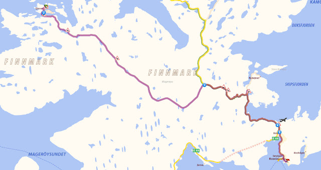 Дорога к Нордкапу ведет через тот же перевал, только на т-образном перекрестке нужно повернуть налево (в город - направо), по указателю. Далее весь путь - горный серпантин, но "правильно" сделоанный и потому не напрягающий.