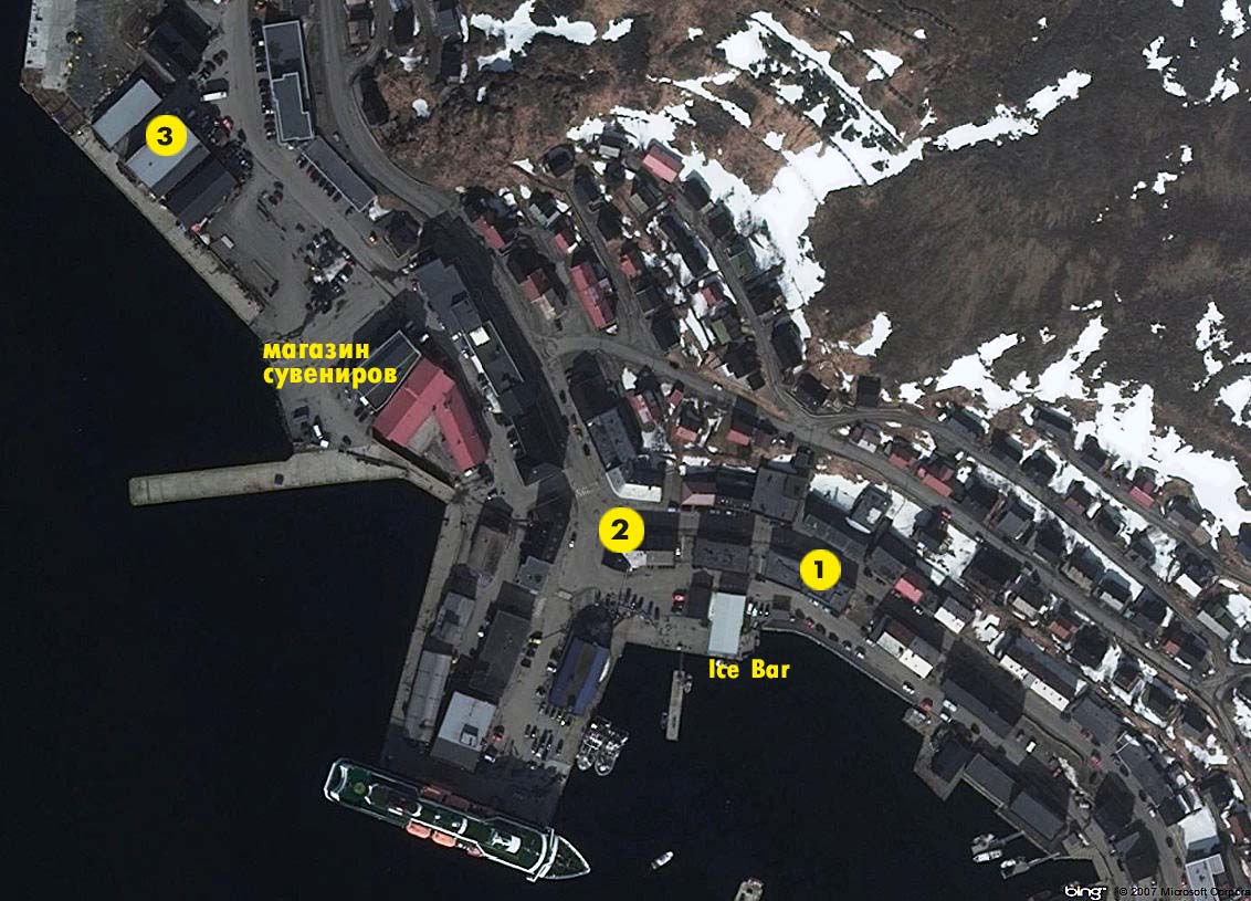 В центре города - порт (в который за сезон заходит до 100 круизных судов, с которых туристов возят на Нордкап), магазин сувениров, местная "достопримечательность" - Айс-бар, построенный из льда (при нем - тоже магазин сувениров).